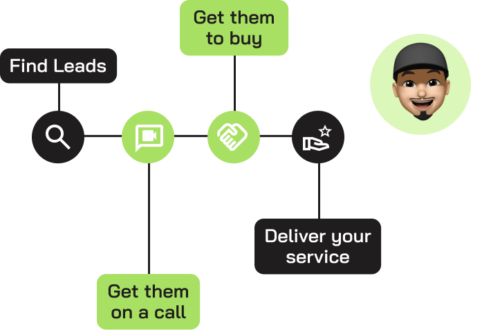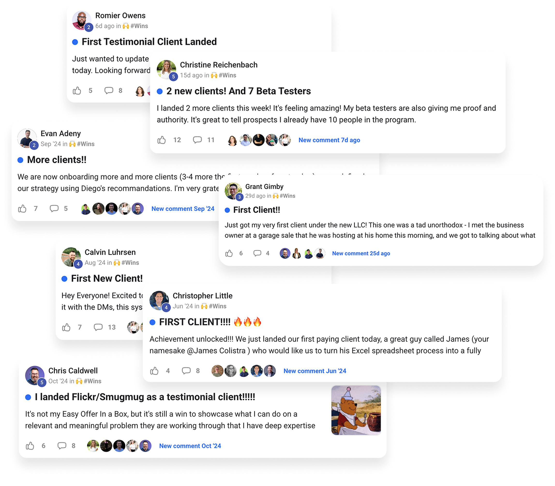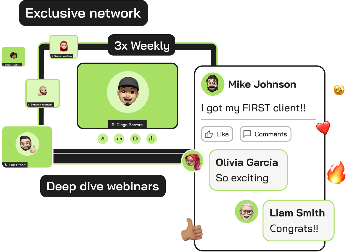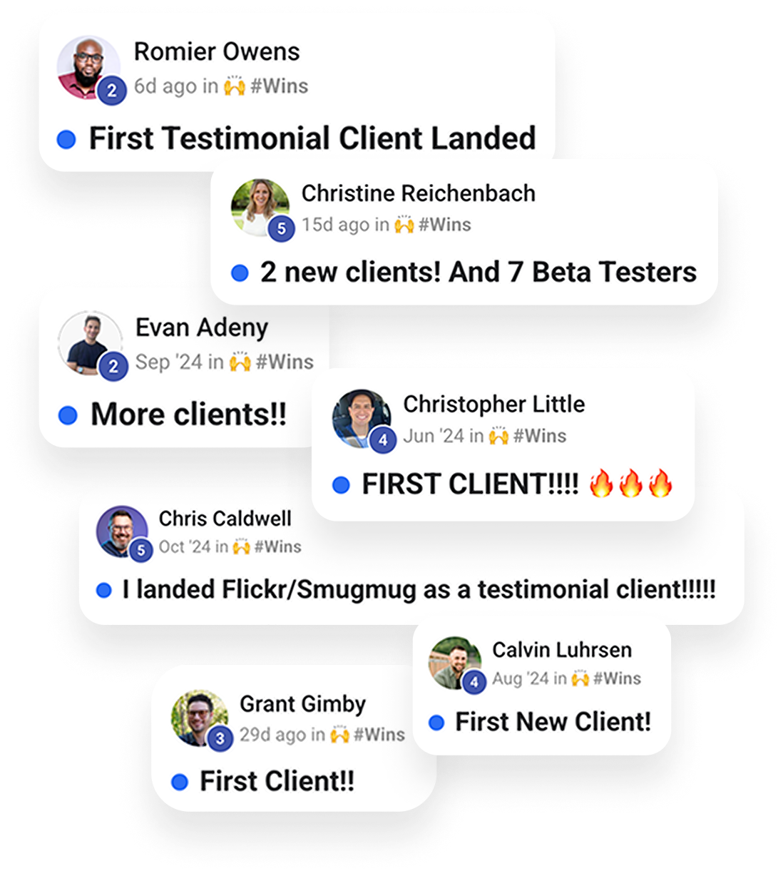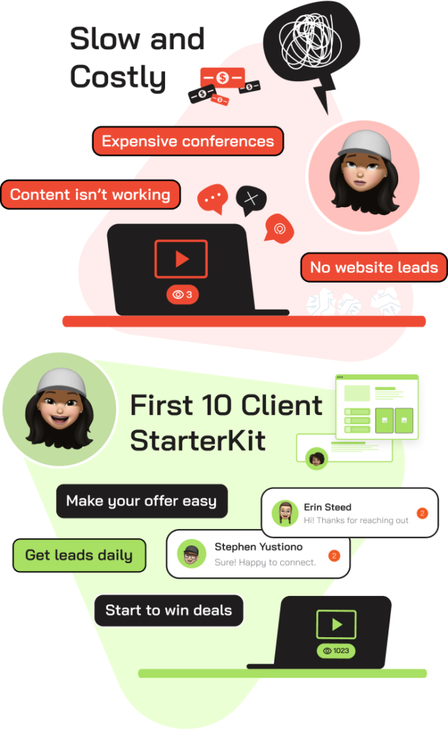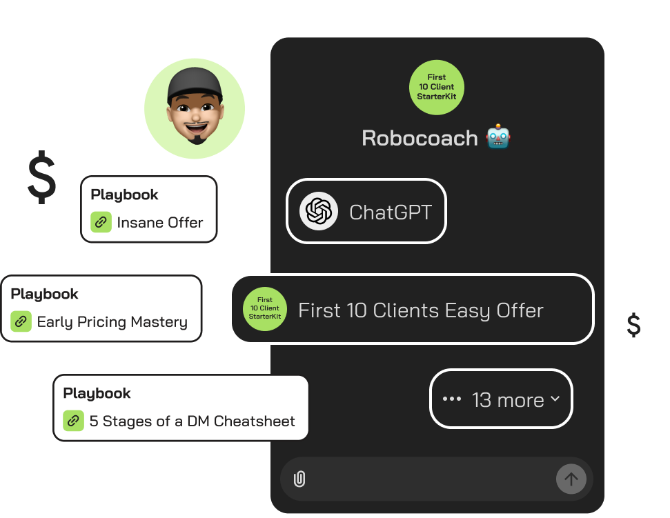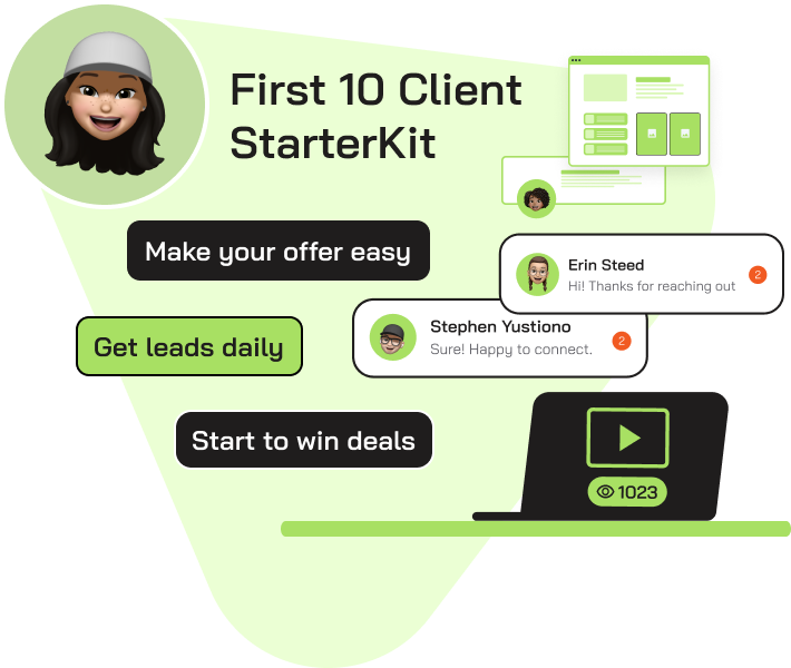 Everything you need to get your first 10 clients: A complete sales system, coaching, a community, digital guides, videos, templates, tailored GPT exercises, and done-for-you creative services.